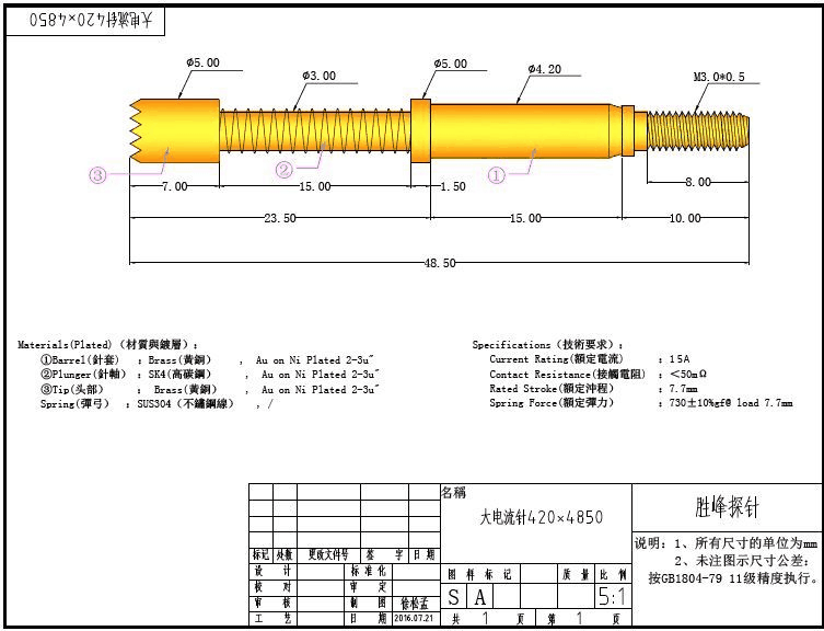 Plunger:Bronze or Brass or BeCu,gold plated or nickel plated;