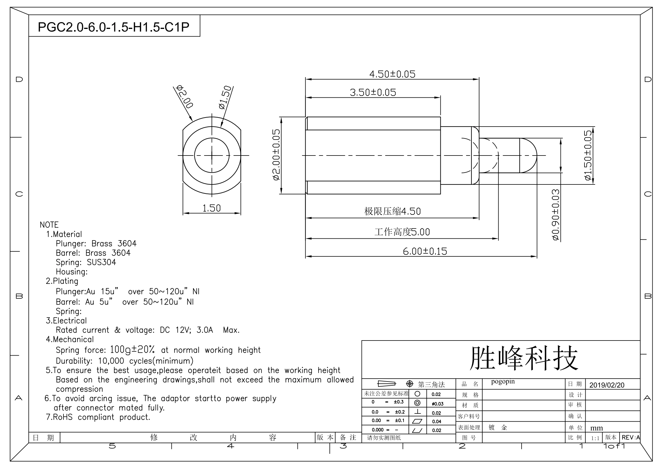| Plating | Plunger:Au 15u” Barrel: Au 5u" over 50~120u” Nl |