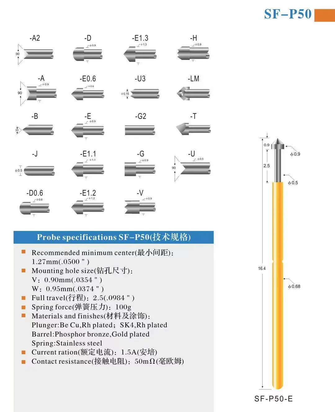 | Materials and finishes | SK4, Ni or Au plated; Barrel:Brass; Spring:Stainless steel |